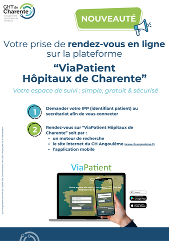 Votre prise de rendez-vous en ligne... c'est maintenant possible sur la plateforme "ViaPatient Hôpitaux de Charente", espace de suivi simple, gratuit & sécurisé.