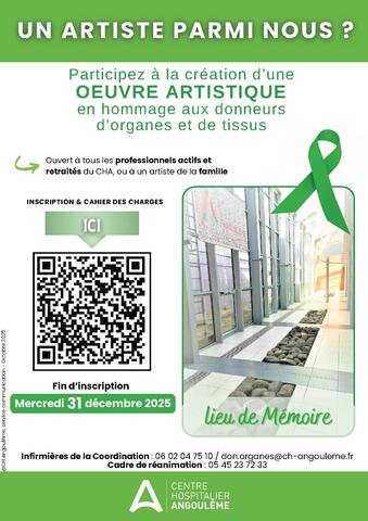 L'équipe de la Coordination du Don d’Organes et de Tissus du Centre Hospitalier d’Angoulême lance un appel à projet pour la création d’une œuvre artistique destinée à être exposée, de façon permanente, dans un lieu de mémoire au sein de l'hôpital, dans la rue centrale (niveau -1) entre les halls Sud et Nord.