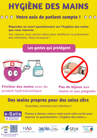 A partir de mi-mars et jusqu’à mi-juin, tous les patients hospitalisés plus de 48h en MCO* recevront, quel que soit leur âge, un questionnaire sur l’hygiène des mains via le dispositif national e-Satis.