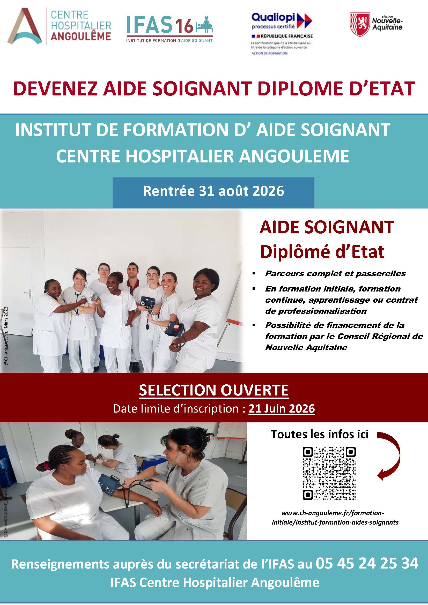 Publié le 23 mars 2026 Inscriptions ouvertes à la sélection au diplôme d'Aide-Soignant pour la rentrée d'août prochain à l'IFAS 16 Retrouvez toutes les informations ici sur le dossier d'inscription et ici sur l'Institut de Formation d'Aide-Soignants du CH Angoulême ! Partager