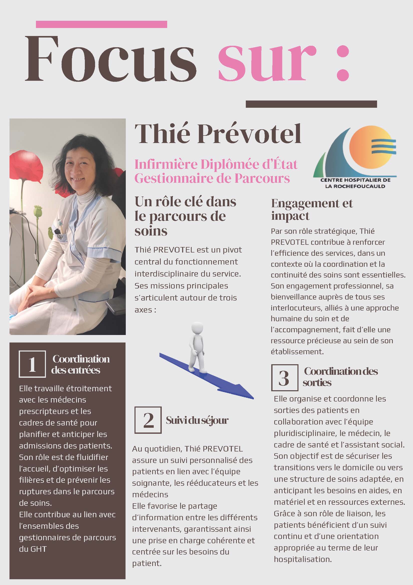 Zoom aujourd'hui sur Thié Prévotel, Infirmière Diplômée d’État et Gestionnaire de Parcours au Centre Hospitalier de La Rochefoucauld. Pivot central du fonctionnement interdisciplinaire, ses missions principales s'articulent autour de trois axes :